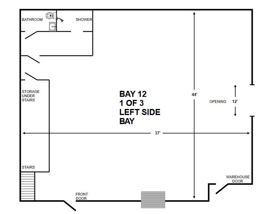 Warehouse Access: Features a dedicated "Warehouse Door" and a 12' internal opening connecting to adjacent spaces